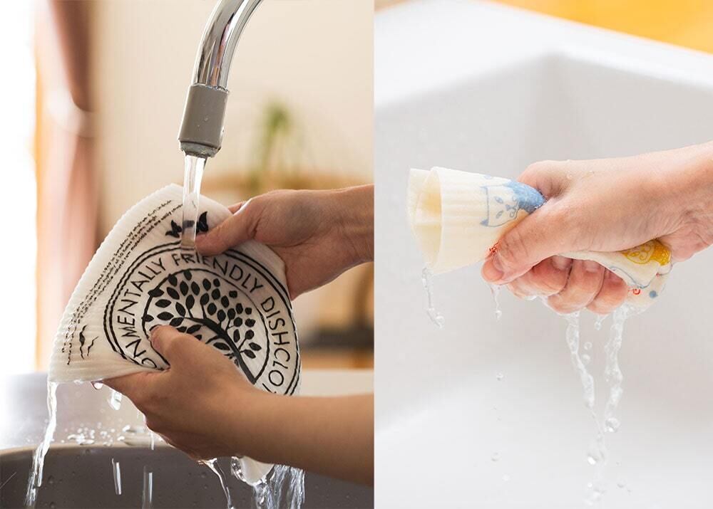 乾いているときは、紙のようにパリッとしていますが、濡らすと弾力のある柔らかふきんに。使う前は水に濡らして、ねじらずに軽く片手でキュッと握って水を切るのがポイント。ねじりは亀裂の原因になります。