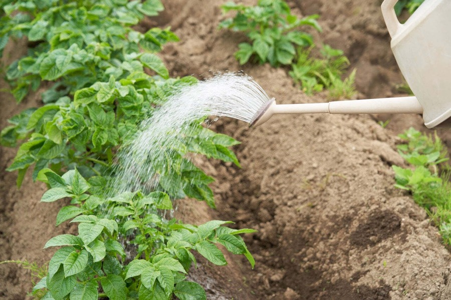 野菜畑には、植え付け前は元肥を入れた後に約100倍希液を一坪あたり2L程度散布し、すきこんでください(家庭菜園であれば、画像のようにジョウロに希釈液を入れて撒くと簡単です)