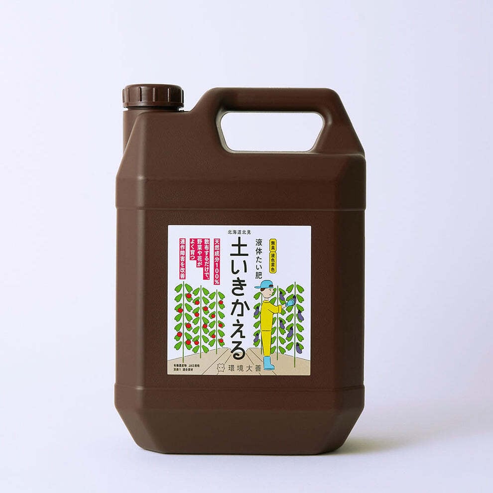 「液体たい肥 土いきかえる」は、土の中の微生物を活性化し、花や作物の育ちを助ける土壌改良液です。